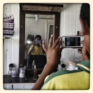 Khaled* takes a photo of Salem* in the barbershop in Za’atari refugee camp.