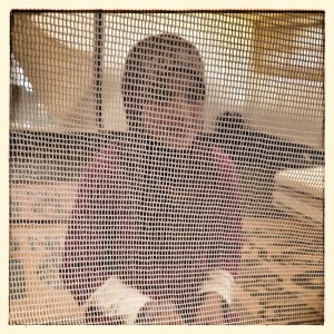 A young girl sits behind a net in her family’s home.