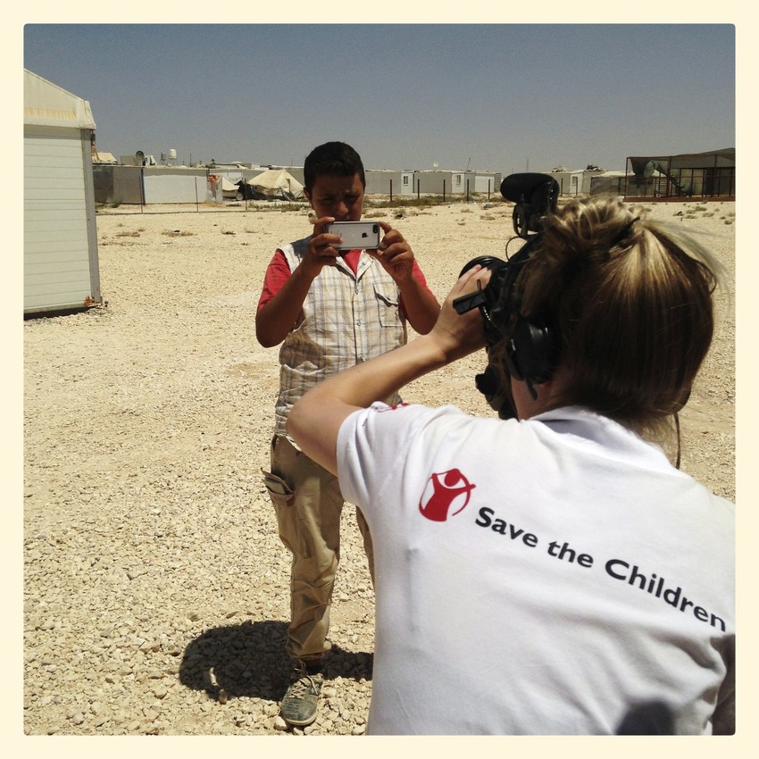 Omar* takes a picture while he is filmed by Save the Children staff.