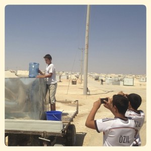 In August 2014 Magnum photographer Michael Christopher Brown travelled to Za’atari and taught a group of Syrian refugee teenagers how to take photographs using an Apple iPhone. This photograph was taken by Khaled*, a 16 year old Syrian boy living in Za’atari refugee camp in Jordan. Part of the project focused on the issue of water in the camp.
