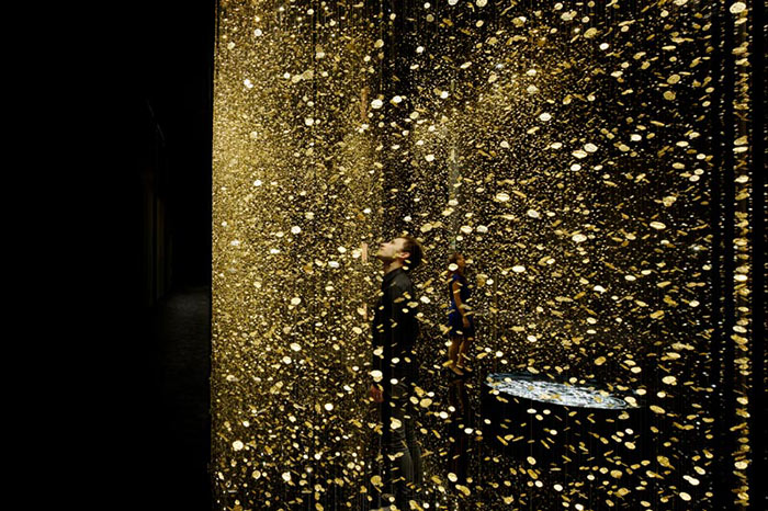 Ο γιαπωνέζος αρχιτέκτονας Tsuyoshi Tane ─ο οποίος ζει και εργάζεται στο Παρίσι─, σε συνεργασία με τη γνωστή εταιρεία ρολογιών CITIZEN, δημιούργησε μια εξαιρετικά εντυπωσιακή εγκατάσταση με ιδιαίτερα πρωτότυπη πρώτη ύλη: την πλάκα ρολογιού χειρός — μάλλον, για να ακριβολογούμε, τις πλάκες 65.000 ρολογιών, οι οποίες αιωρούνται σε σκοτεινό χώρο, δεμένες από μαύρα νήματα, δίνοντας έτσι την εντύπωση χρυσών σταγόνων βροχής.
