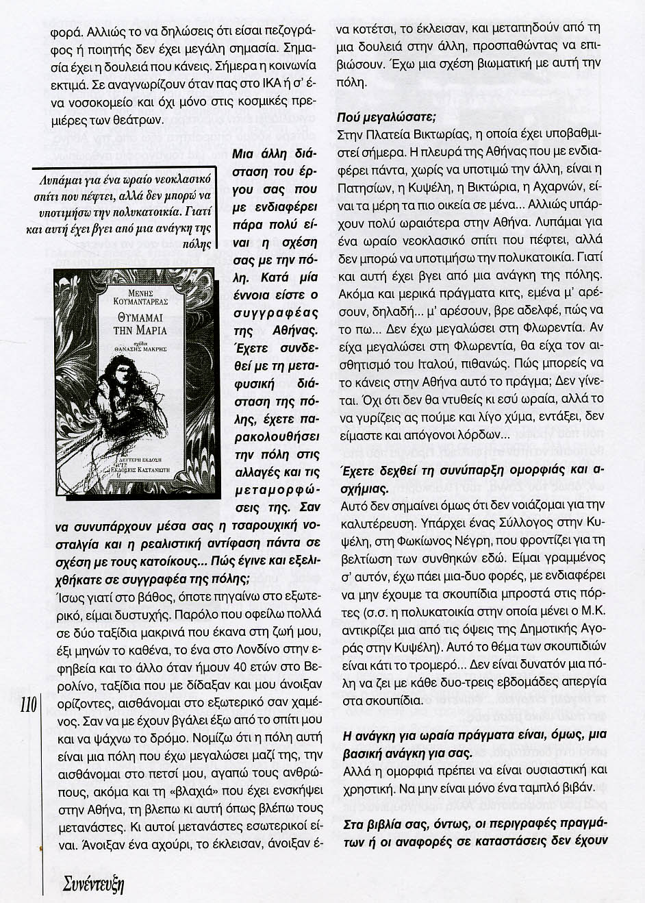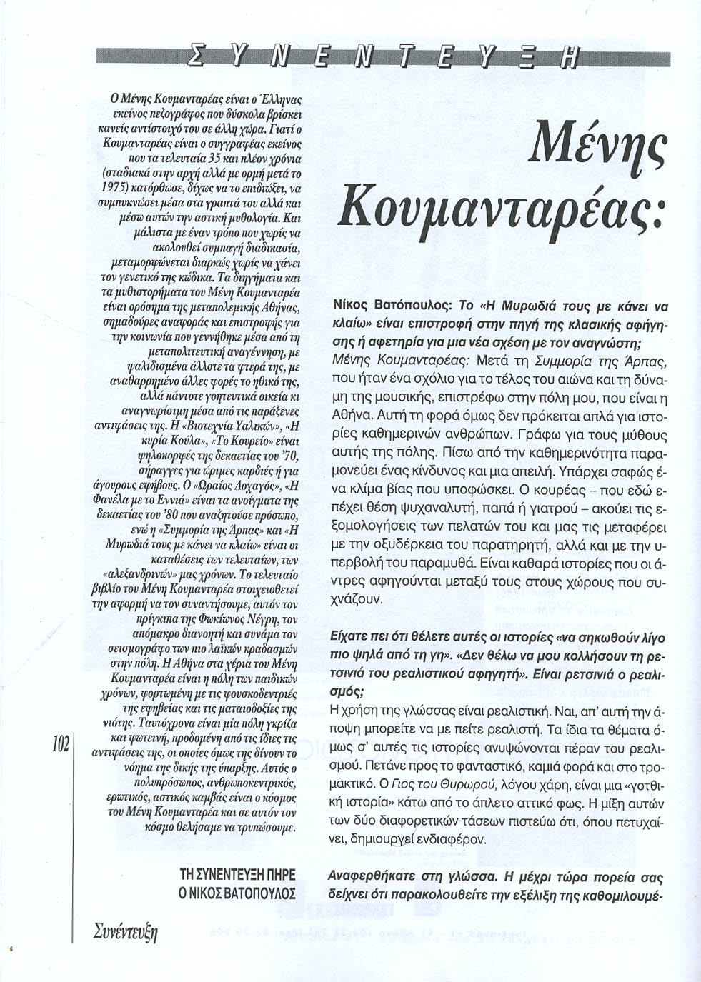 Από το μπαλκόνι του ο Μένης Κουμανταρέας βλέπει τη Δημοτική Αγορά της Κυψέλης και τη Φωκίωνος Νέγρη. Ο ίδιος όμως προτιμά πάντα την πλατεία Βικτωρίας, εκεί όπου έζησε τα παιδικά και τα νεανικά του χρόνια. Αυτές και άλλες γωνιές της πρωτεύουσας (το Γκάζι, το Μεταξουργείο, του Ψυρρή, η Ομόνοια, η Πατησίων) επιλέγει για τόπο δράσης των ηρώων του. Στους αθηναϊκούς δρόμους έχουν κινηθεί οι ήρωες στην «Κυρία Κούλα», τη «Γυναίκα που πετάει», το «Κουρείο», τη «Βιοτεχνία υαλικών», τη «Φανέλα με το 9» που έκανε και κινηματογραφική καριέρα. Στην πλατεία Βικτωρίας έπαιζαν φλιπεράκια -«μηχανάκια»- οι ήρωες του ομώνυμου πρώτου του βιβλίου. Σε αυτήν τη διαδρομή ο Μένης Κουμανταρέας έχει πιστούς αναγνώστες, τα βιβλία του -ακόμα και τα «δυσπώλητα» διηγήματα- κάνουν πολλές εκδόσεις, η κριτική πάντα στέκεται. Γιατί στις σελίδες των βιβλίων του συναντάει ανθρώπους διπλανούς, χαμηλόφωνους, τους μικροαστούς που όλοι προσπερνάμε. Λίγες μέρες πριν από την εκδήλωση για τη συγγραφική του επέτειο, με τη σύντροφό του, κ. Λιλή, πάντα δίπλα του, ο Μένης Κουμανταρέας είχε διάθεση εξομολογητική, αλλά και μαχητική.