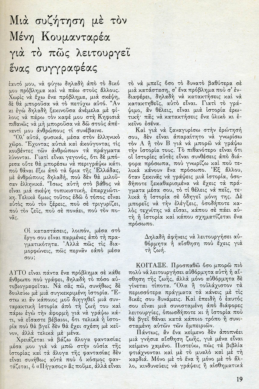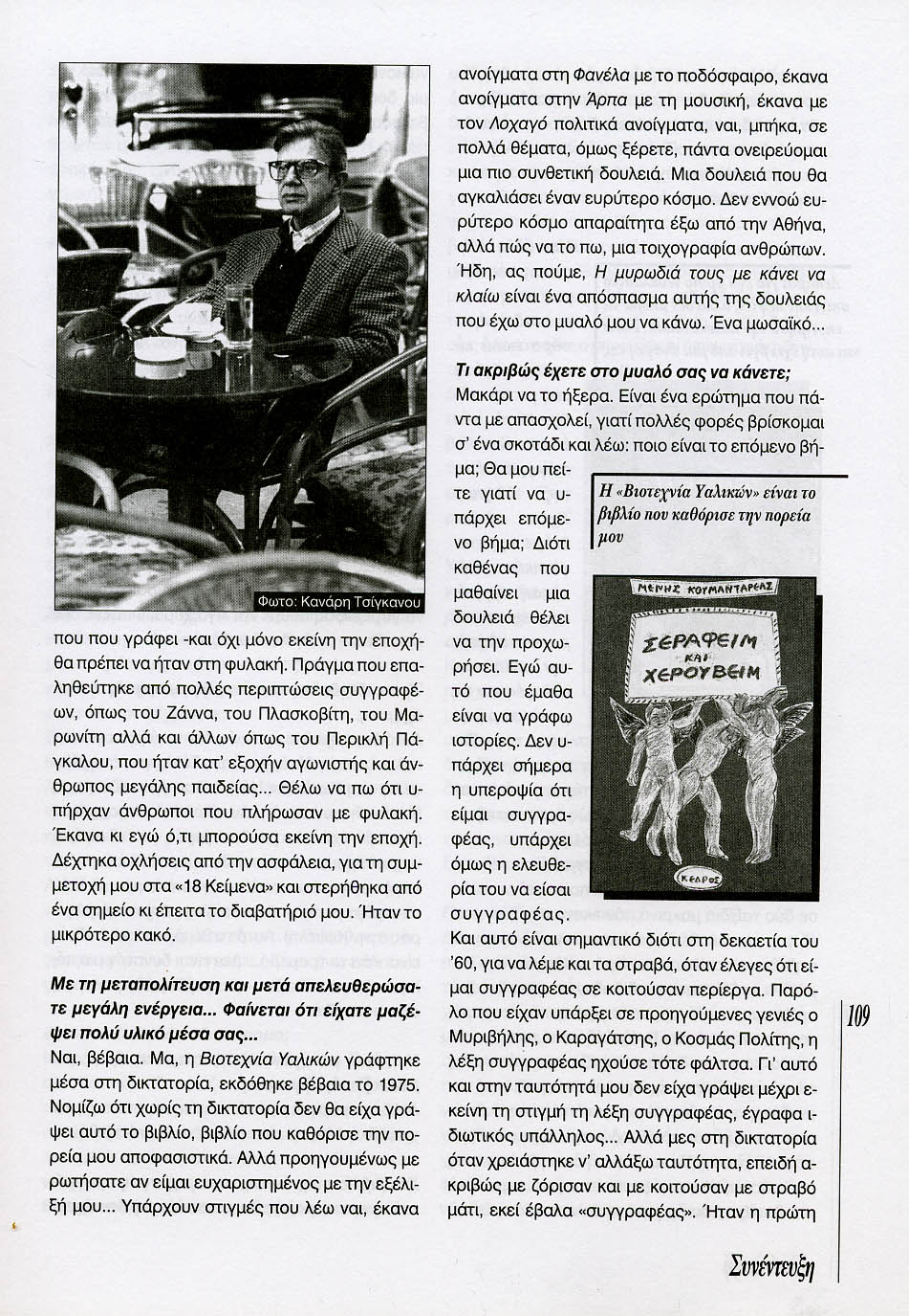 Τον βρήκα στο σπίτι της Κηφισιάς. Ελαφρώς χλωμό, που του πάει καθώς του δίνει ένα αέρινο χρώμα, έπειτα από μια σύντομη περιπέτεια υγείας. Νόμιζα ότι δεν θα έχει κέφι για συζήτηση, αλλά αντίθετα είχε μεγάλη όρεξη. Αν και δηλώνει άνθρωπος του 19ου αιώνα, παρακολουθεί εντατικά τα πάντα. Μιλήσαμε για την πολιτική κρίση («θα την ξεπεράσουμε, έχουμε περάσει πολύ χειρότερες»), την κρίση στο βιβλίο («το καλό βιβλίο δεν πεθαίνει»), τη συγκίνησή του για τις παλιές ταινίες του σινεμά που επανεκδίδονται, αλλά και τα σχέδιά του για το μέλλον. Γράφει, ίσως, το μυθιστόρημα της ζωής του. «Δεν ξέρω πότε θα τελειώσει» λέει, αλλά εκτός από αυτό έχει στα σκαριά δύο νέα βιβλία: μια ξανακοιταγμένη έκδοση με διηγήματα του Μέλβιλ και μια νέα συλλογή διαφόρων κειμένων του. Προς το παρόν οι φίλοι του, παλαιοί και νέοι, μπορούν να χαρούν τρία βιβλία του που επανεκδόθηκαν: Το αρμένισμα (1967), Η κυρία Κούλα (1978) και Το κουρείο (1979). Σε αυτά επικεντρώθηκε κυρίως η κουβέντα μας.