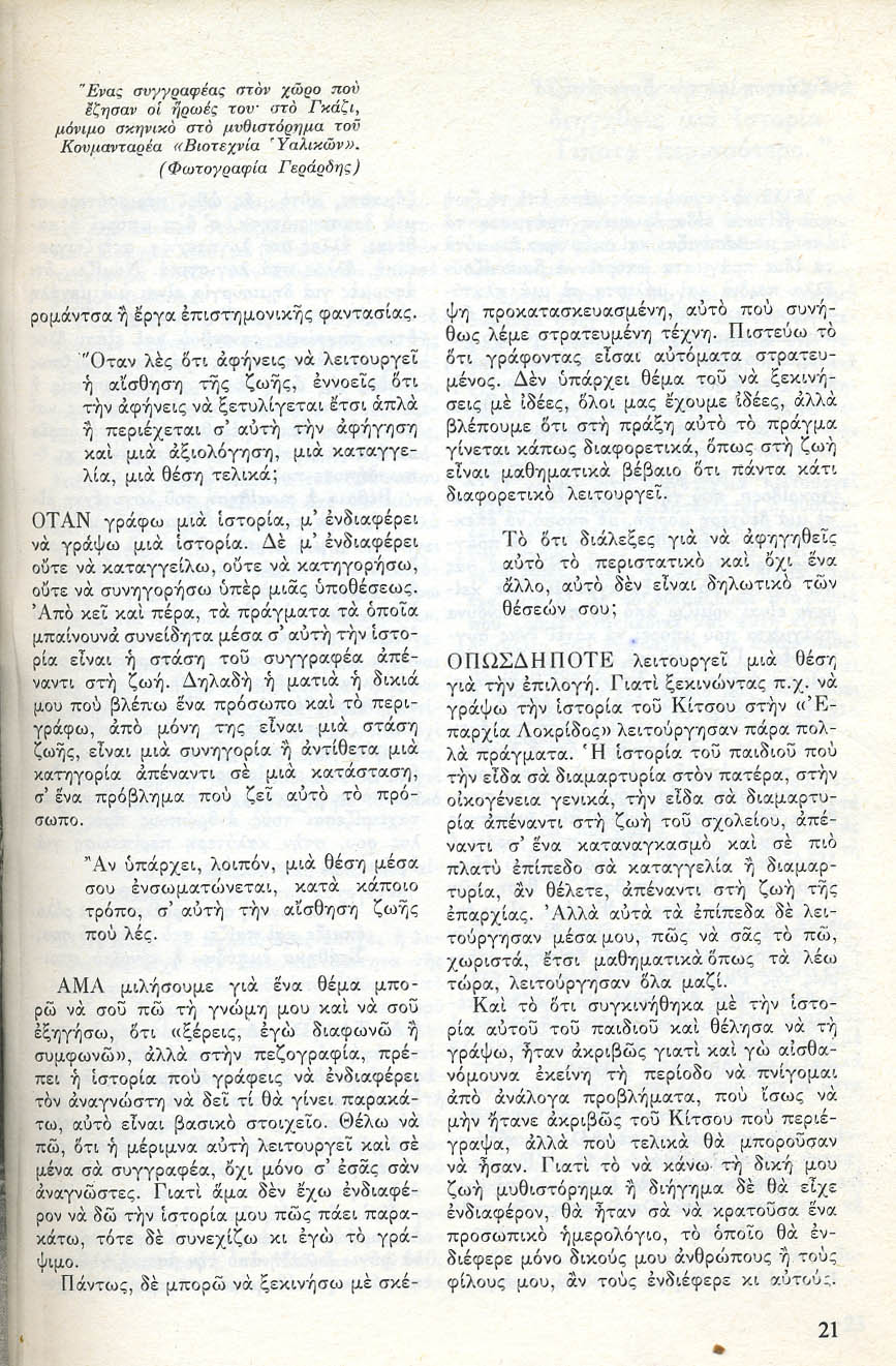[…Τον περισσότερο καιρό, πίνοντας και κουτσοπίνοντας, άκουγα µε δέκα αυτιά αυτές τις ιστορίες που, είτε γνήσιες είτε πλαστές, είχαν ένα ενδιαφέρον για µένα, που ζητούσα να ξεφύγω από τη δική µου ιστορία. Μία µόνο προϋπόθεση έθετα: αυτός που τις έλεγε να ξέρει να τις αφηγείται, να σε μεταφέρει αλλού και να σου εξάπτει τη φαντασία. Τότε µε έκαναν να θέλω να πω κι εγώ µια ιστορία. Μα εγώ, βλέπεις, προτιμώ να τις γράφω… Μ.Κ.]