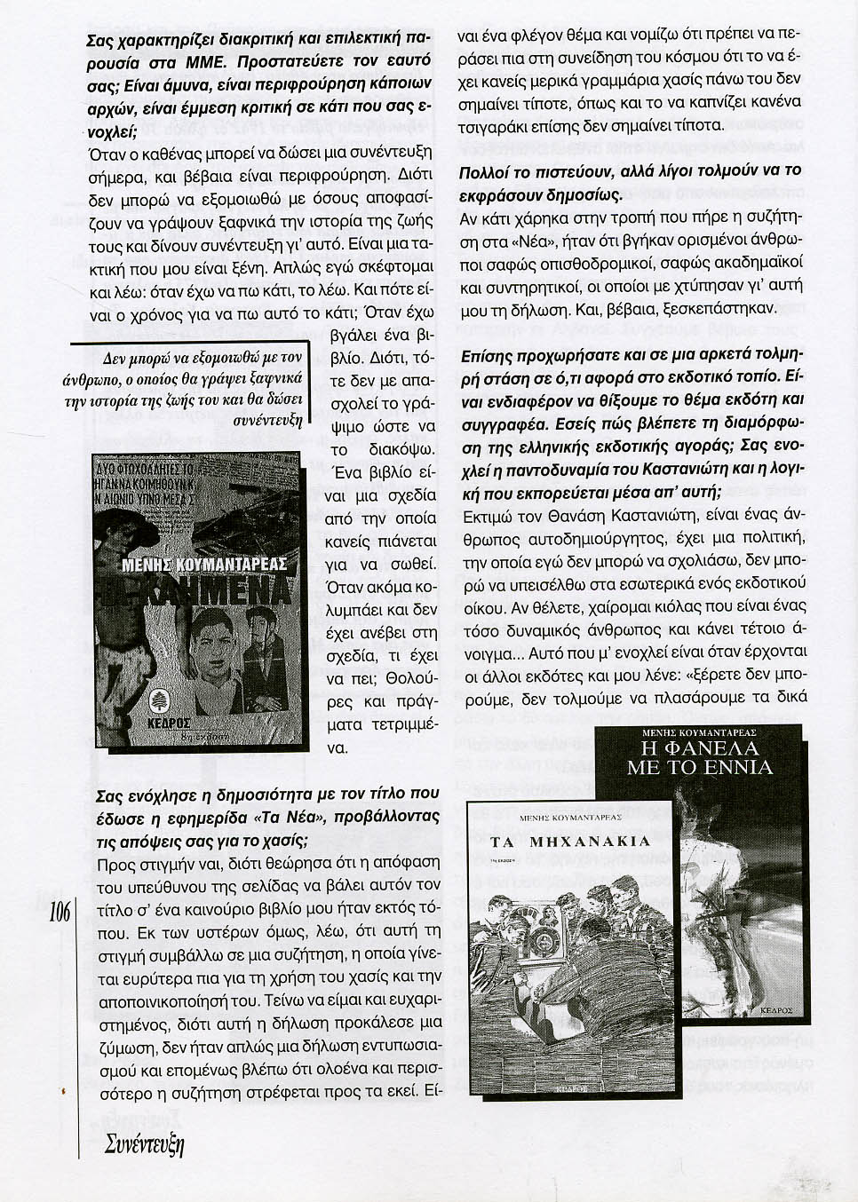 Αυτός που με έσπρωξε και μου είπε ότι «αυτά είναι δημοσιεύσιμα και πολύ καλύτερα από άλλων» ήταν ο Βασίλης Βασιλικός. Μετά πήγα στον Μάνο τον Χατζιδάκι. «Α», μου λέει, «εντάξει, θα σε στείλω στον Φέξη», έναν εκδότη με κύρος την περίοδο εκείνη. Μου δίνει ένα σημείωμα και το πάω στον Φέξη, ο οποίος το βλέπει και μου λέει: «Βεβαίως, κύριε Κουμανταρέα, θα σας το βγάλω το βιβλίο. Αλλά όχι μ’ αυτόν τον τίτλο». Ποιον τίτλο, λέω εγώ. Ο Μάνος είχε γράψει στο σημείωμα ανάμεσα σε άλλα, σαν λογοπαίχνιο, τον τίτλο του τραγουδιού «Ο ταχυδρόμος πέθανε»! Βέβαια ο τίτλος ήταν «Τα μηχανάκια», που δεν είναι τα δίκυκλα, αλλά τα φλίπερ, με τα οποία έπαιζα μανιωδώς εγώ τότε. Αυτά περιγράφω, και τα παιδιά που έπαιζαν φλιπεράκια εκείνη την εποχή. Τα οποία αμέσως μετά απαγορεύτηκαν, από ποιον νομίζεις; Από τον Γεώργιο Παπανδρέου, επί Ενώσεως Κέντρου.