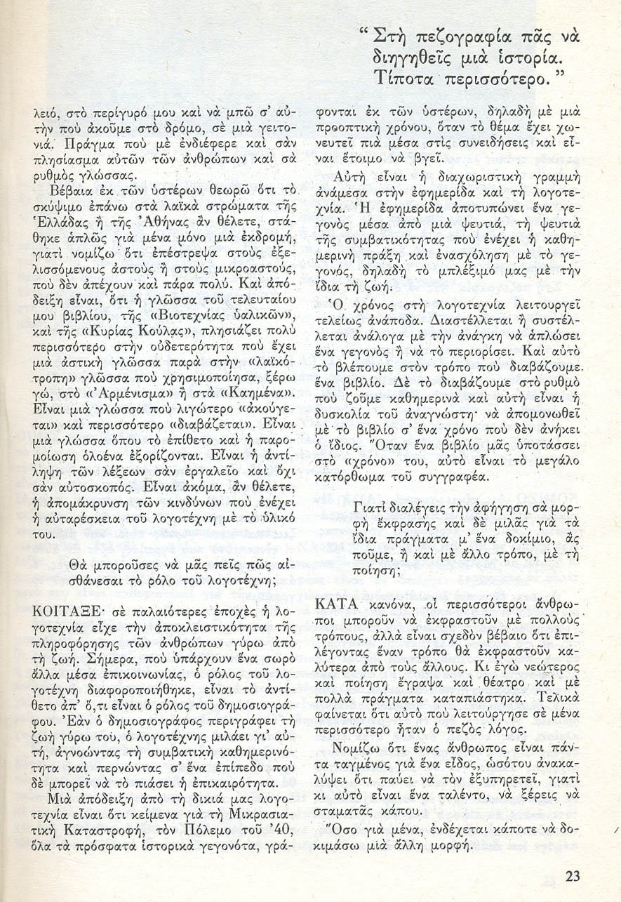 Στα πρώτα μου βιβλία παίζω με διάφορα πράγματα σε σχέση με τη γλώσσα. Στα “Μηχανάκια” η γλώσσα είναι ήδη στέρεη. Από την “Κυρία Κούλα” και τη “Βιοτεχνία υαλικών” η γλώσσα γίνεται πιο σταθερή, αστική ας πούμε, και λιγότερο λαϊκότροπη. Το θέμα είναι να μπορείς να φλερτάρεις τους λαϊκούς ήρωες με τη δική σου γλώσσα και αισθητική. Υπάρχουν εξαιρέσεις: ένα αλάνι δεν μπορεί να μιλάει όπως π.χ. ο Λευτέρης Βογιατζής ή στον “Ωραίο λοχαγό” χρησιμοποιώ μια καθαρεύουσα που είναι η γλώσσα του Συμβούλου της Επικρατείας, την οποία γνώριζα εν μέρει από τον πατέρα μου.