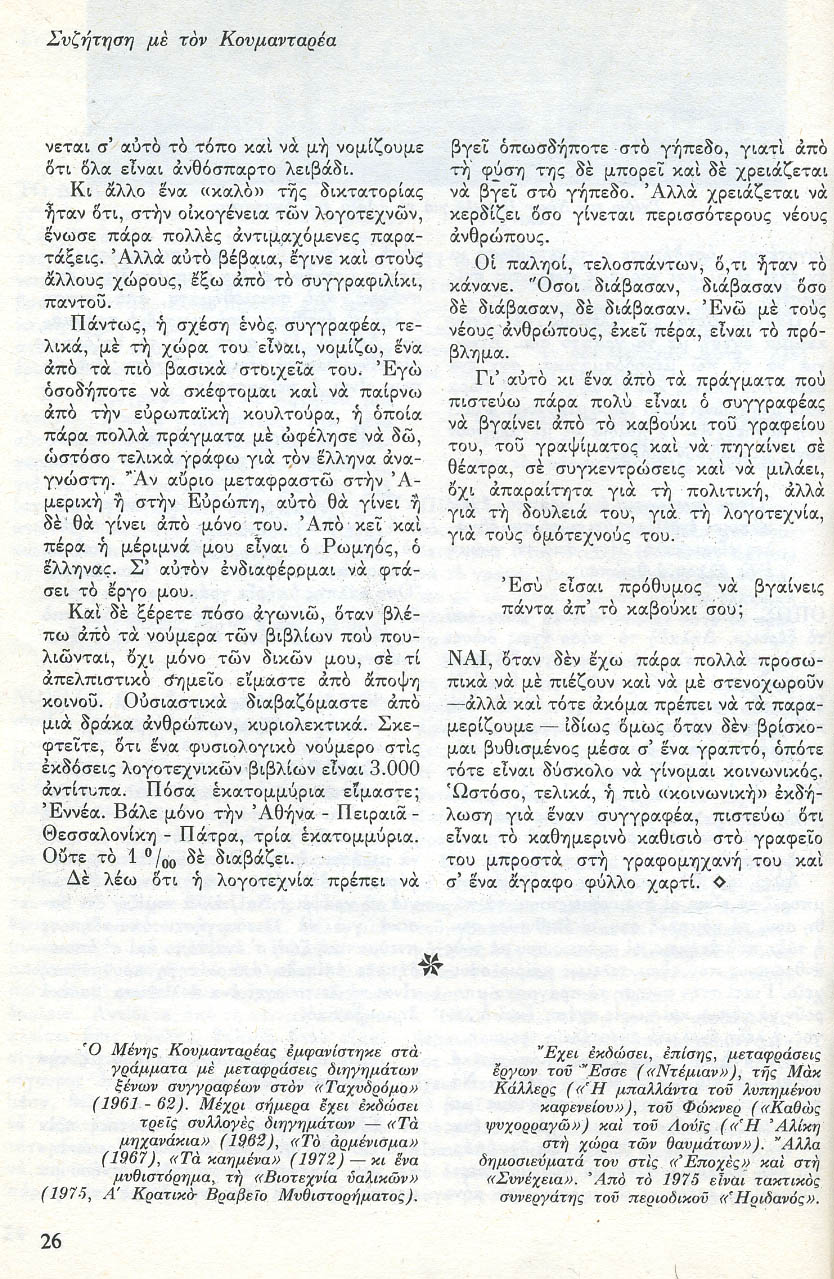 Πιστεύω ότι το ταλέντο είναι πάνω από τις κοινωνικές συνθήκες, την αφασία, την ανία, τα ναρκωτικά. Ενα ισχυρό ταλέντο τα αποτυπώνει όλα αυτά και πάει και παραπέρα. Στενοχωριέμαι που δεν υπάρχει ακόμα ένα μεγάλο όνομα στους μικρούς. Γιατί θέλω να έχουμε διαδόχους. Η λογοτεχνία είναι μια υπόθεση που κληρονομείται, που μεταλαμπαδεύεται. Το άλλο που παρατηρώ στους νεότερους -και με στενοχωρεί- είναι ότι δεν διαβάζουν αρκετά ελληνική λογοτεχνία. Ενα άλλο ελάττωμα είναι η υπεροψία. Για να είσαι υπερόπτης πρέπει να έχεις λιώσει πολλά παντελόνια στην καρέκλα. Καταλαβαίνω ότι θέλεις να σκοτώσεις τους γεννήτορές σου, καταλαβαίνω να σκέφτονται «ώς πότε αυτός ο Κουμανταρέας; Να κάτσει στη γωνιά του, να πεθάνει». Δεν με σοκάρει αυτό, είναι φυσικό, βιολογικό. Με σοκάρει όμως να επαίρονται για πράγματα που δεν έχουν κάνει ακόμα.
