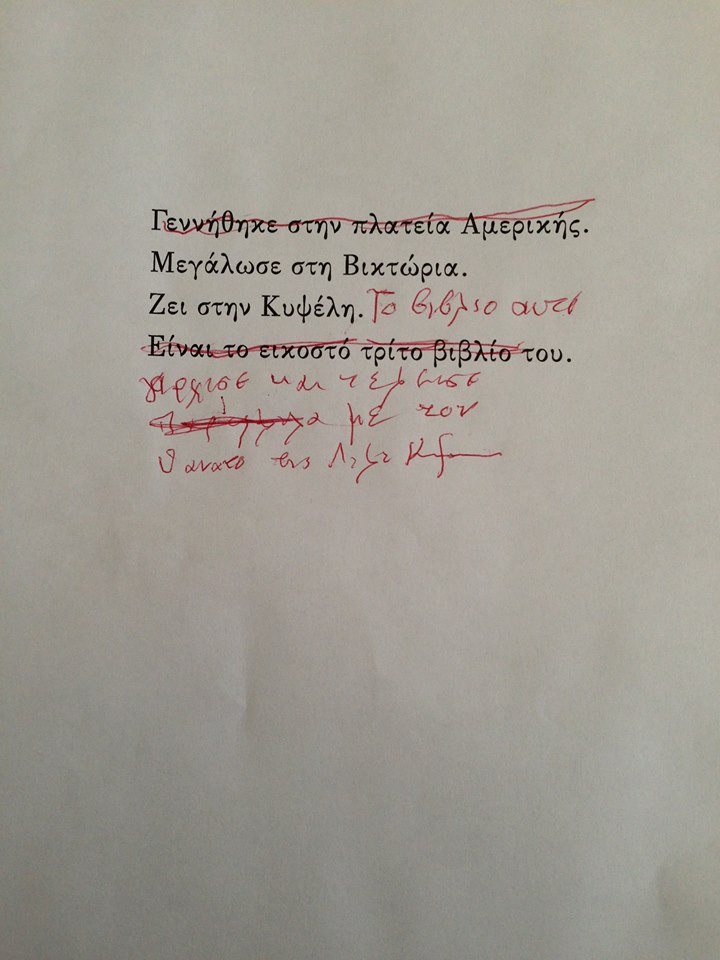 Το τελευταίο βιογραφικό του Μένη Κουμανταρέα, όπως ιδιόχειρα το διατύπωσε (από τη σελίδα των Εκδόσεων Πατάκη στο facebook)