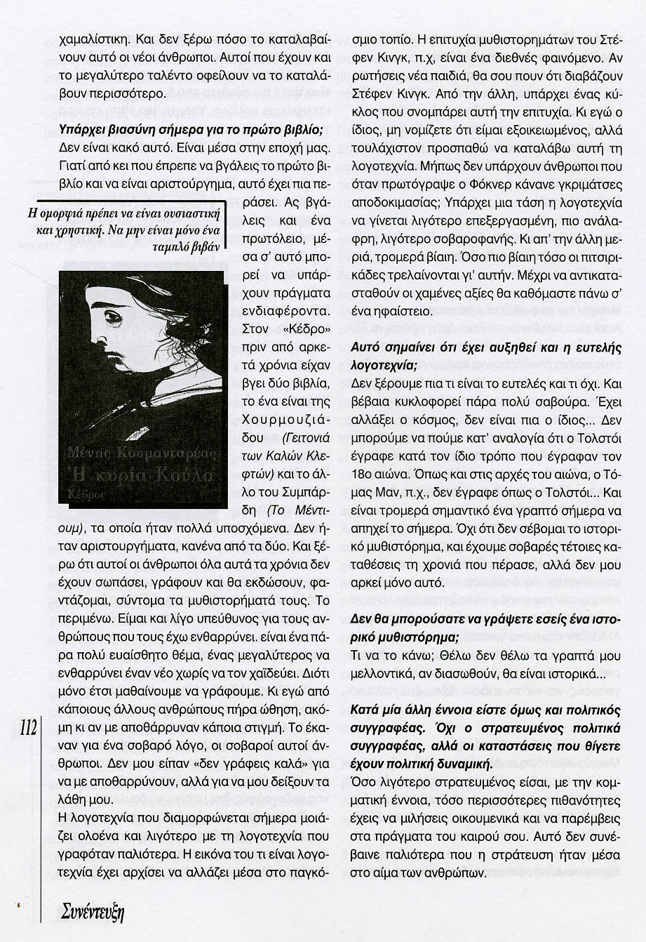 Θα παρατηρείτε, φαντάζομαι, πώς κινείται η κοινωνία, άλλωστε ένα από τα βασικά χαρακτηρισμούς ενός συγγραφέα δεν είναι να παρατηρεί;