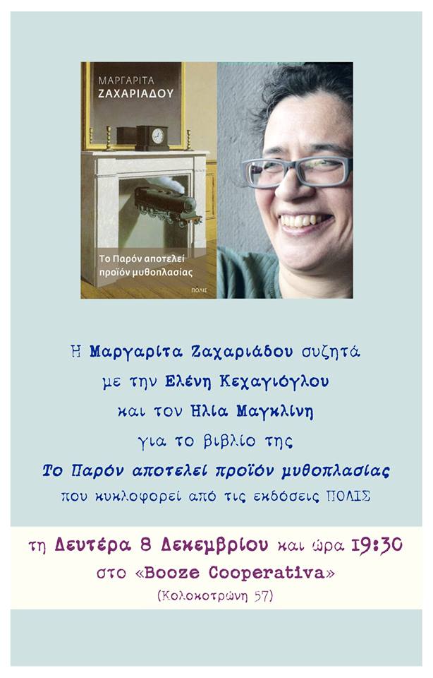 Η Μαργαρίτα Ζαχαριάδου, σταθερή συνεργάτης του dim/art από τις πρώτες μέρες του, παρουσιάζει σήμερα, Δευτέρα 8 Δεκεμβρίου, στις 7:30 μ.μ. στο Booze Cooperativa (Κολοκοτρώνη 57), το βιβλίο της Το Παρόν αποτελεί προϊόν μυθοπλασίας, το οποίο κυκλοφορεί από τις εκδόσεις Πόλις. Για το βιβλίο θα μιλήσουν η φιλόλογος και επιμελήτρια εκδόσεων Ελένη Κεχαγιόγλου, επίσης σταθερή συνεργάτης του dim/art, και ο δημοσιογράφος Ηλίας Μαγκλίνης, κείμενα του οποίου φιλοξενούμε συχνά στο dim/art. Τα κείμενα και τη φωνή της Μαργαρίτας Ζαχαριάδου «διαβάζουν» και επενδύουν μουσικά με τον τρόπο τους οι Estimated Prophets, δηλαδή ο Αντώμης Μαράτος και ο Γιώργος Τσακνιάς, αρχισυντάκτης του dim/art.