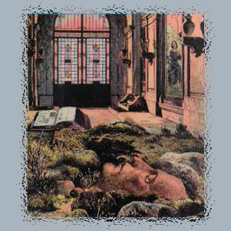 Ο φύλακας με οδήγησε σε μια μεγάλη πόρτα, την ξεκλείδωσε, μετά άναψε ένα χλωμό φως και με άφησε μόνη. Άκουσα πίσω μου το κλειδί να γυρίζει στην κλειδαριά· έτσι βρέθηκα κλεισμένη μέσα στη βιβλιοθήκη, σαν φυλακισμένη. Από κάπου ερχόταν ρεύμα, και οι αράχνες, σαν βρώμικη ξεφτισμένη γάζα, κυμάτιζαν απλωμένες στα ράφια με τα βιβλία, όπως στις κάβες πάνω στα αραδιασμένα μπουκάλια με παλιό κρασί. Όλοι οι χώροι ήταν ίδιοι, επικοινωνούσαν με ένα στενό πέρασμα και παντού έφτανε αυτό το ρεύμα που δεν ήξερα από πού έρχεται.