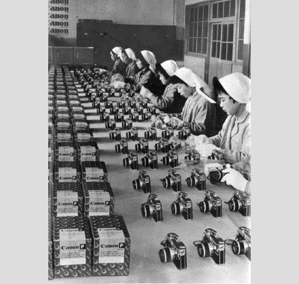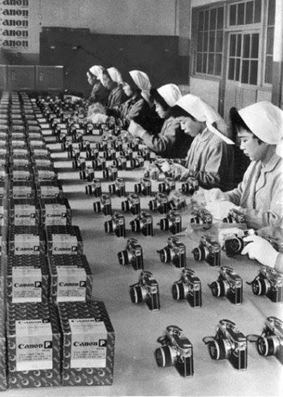 Ιαπωνία, c. 1960: Η γραμμή παραγωγής στο εργοστάσιο της Canon. H Canon P («Populaire») κυκλοφόρησε τον Μάρτιο του 1958. Σχεδιασμένη ως η φθηνή βερσιόν του μοντέλου VI-L που είχε κυκλοφορήσει λίγους μήνες νωρίτερα, η Canon P κατόρθωσε να επικρατήσει και να γίνει όντως πολύ δημοφιλής, στα τρία χρόνια που κράτησε η παραγωγή της, αλλά και να παραμένει σήμερα περιζήτητη από τους συλλέκτες. Τηλεμετρική (συνεπώς χωρίς καθρέφτη που ανεβοκατεβαίνει, άρα και χωρίς κραδασμούς επίσης), έβγαινε με δύο εκδοχές νορμάλ (50mm) φακού, ο ένας με διάφραγμα 2,8 και ο άλλος, ιδιαίτερα φωτεινός, με 1,4. Έβγαινε επίσης με δύο σώματα, χρώμιο (ασημί) και μαύρο. Μέχρι το 1962, οπότε και σταμάτησε η παραγωγή του μοντέλου, είχαν κατασκευαστεί 87.875 Canon P.