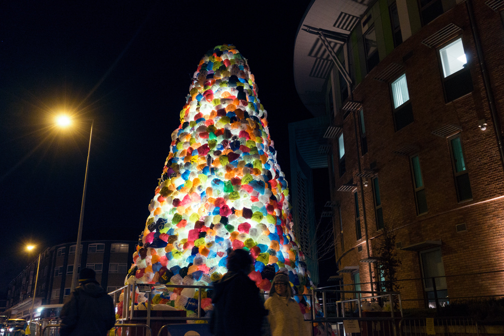 Οι ακτιβιστές καλλιτέχνες που συγκροτούν την ομάδα Luzinterruptus ονειρεύονται τα Χριστούγεννα απελευθερωμένα από κάθε τι πλαστικό, όπως ήταν μια φορά κι έναν καιρό. Και αντί για το παραδοσιακό έλατο, επιλέγουν να εμφανίσουν ένα χριστουγεννιάτικο δέντρο που αποθεώνει τον καταναλωτισμό, ως σχόλιο αφενός στην κοινωνία μας που την πνίγει το πλαστικό, αφετέρου στην καταναλωτική μανία των γιορτών. Το έργο τους, ωστόσο, παρότι ανορθόδοξο ως χριστουγεννιάτικο ντεκόρ, είναι εικαστικά συναρπαστικό.