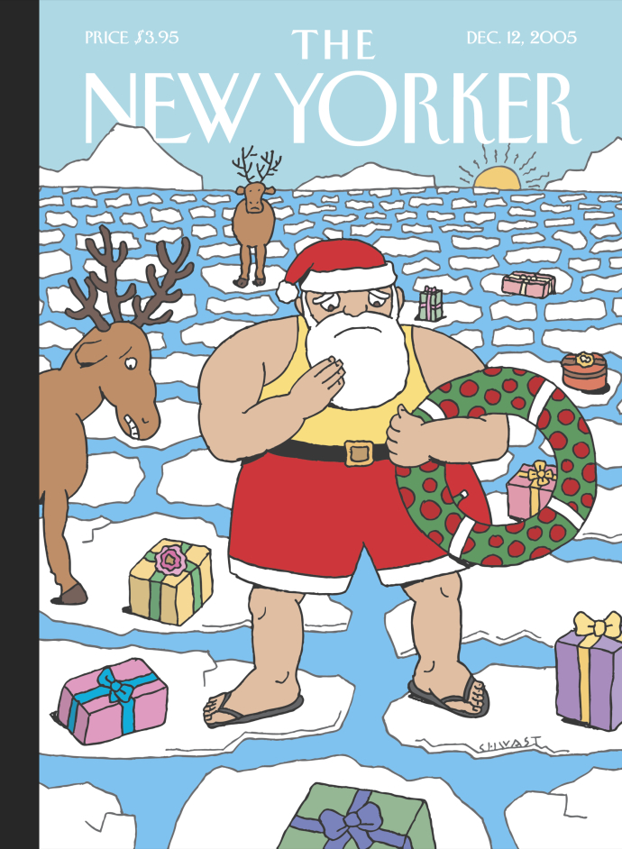 Από τότε που ο Άγιος Βασίλης έκανε την παρθενική του εμφάνιση σε εξώφυλλο του θρυλικού περιοδικού The New Yorker, πριν από σχεδόν ενενήντα χρόνια, επανεμφανίστηκε στο περιοδικό με πολλούς ευφάνταστους τρόπους, από έναν κοστουμαρισμένο κύριο που φοράει το χαρακτηριστικό κόκκινο σακάκι με τη γούνα έως έναν κάπως έκπληκτο Άγιο Βασίλη με το μπανιερό του σε έναν Βόρειο Πόλο που παραείναι ευχάριστος. Άλλες πάλι χρονιές, τους εικονογράφους του περιοδικού τούς είχε καταλάβει το πνεύμα των Χριστουγέννων και ζωγράφιζαν τις λατρεμένες ιεροτελεστίες των γιορτών: κάλαντα, κάρτες και καταναλωτικά όργια. Απολαύστε —όπως πάντα υπεύθυνα από το dim/art— τα εξώφυλλα αυτά από το αρχείο του New Yorker.