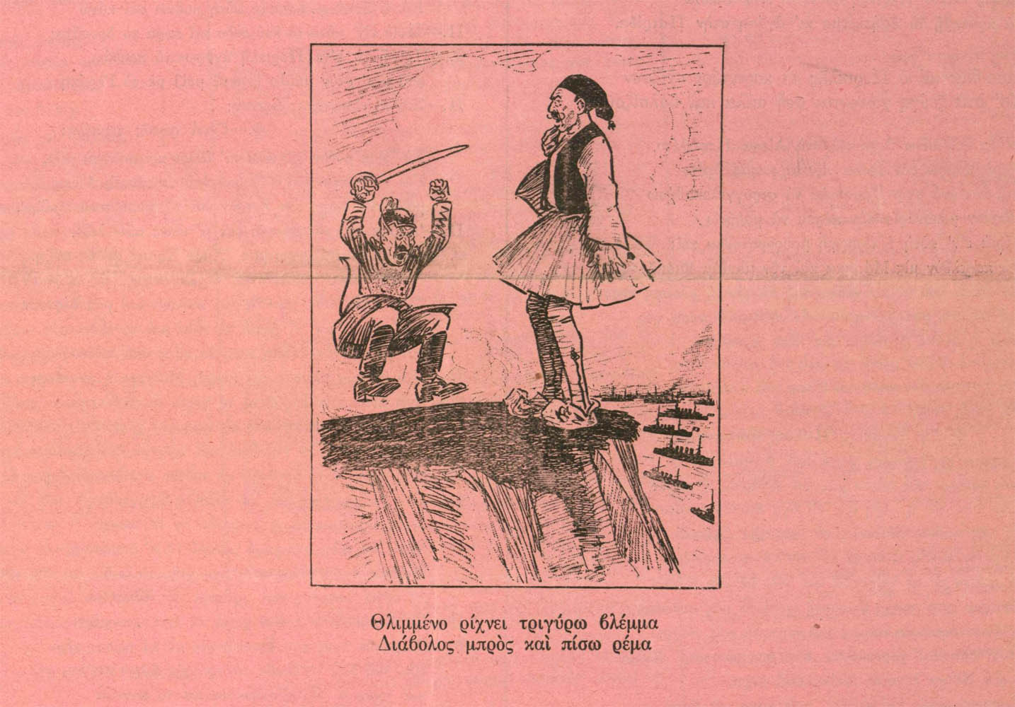 «Θλιμμένο ρίχνει τριγύρω βλέμμα / Διάβολος μπρος και πίσω ρέμα» — Προφητική γελοιογραφία. Σαν σήμερα, πριν από 99 χρόνια. Από την εφημερίδα Ο Σάτυρος της Νέας Υόρκης, 22 Ιανουαρίου 1916.