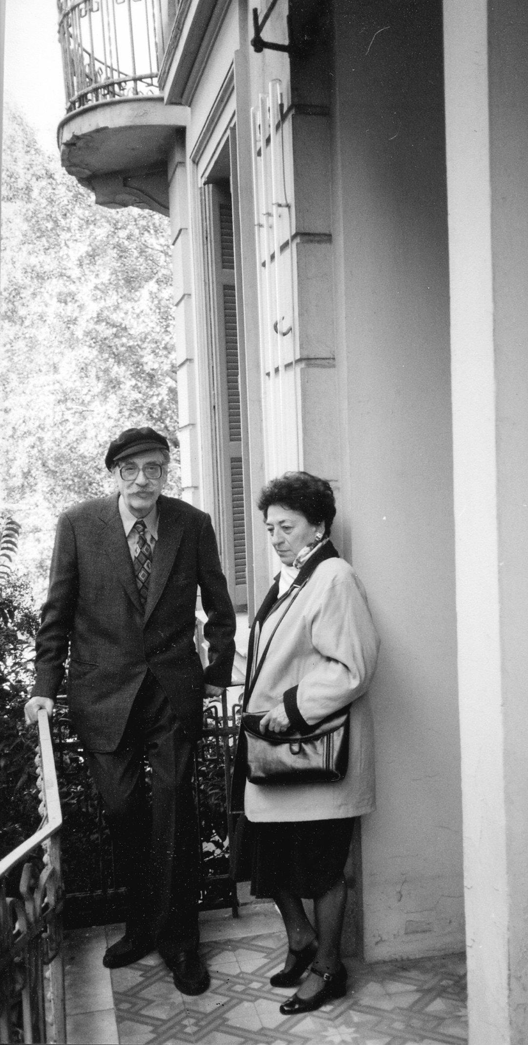 Με τη σύζυγό του Νόρα, στο μπαλκόνι του πατρικού σπιτιού, Ιουστινιανού και Μητροπολίτου Γενναδίου. Το σπίτι σήμερα στεγάζει σύνδεσμο φιλάθλων. Το επισκέφθηκε το 1997, σε μία από τις λίγες «επιστροφές» του στη Θεσσαλονίκη, με αφορμή εκδήλωση τιμής στον ίδιο και την παρουσία του, που διοργανώθηκε στο πλαίσιο της «Πολιτιστικής Πρωτεύουσας». (Φωτο: Μ. Πολυβίου, δημοσιεύθηκε στο τεύχος – αφιέρωμα στον Μανώλη Αναγνωστάκη τού περιοδικού Εντευκτήριο, τεύχος 71, 2005).