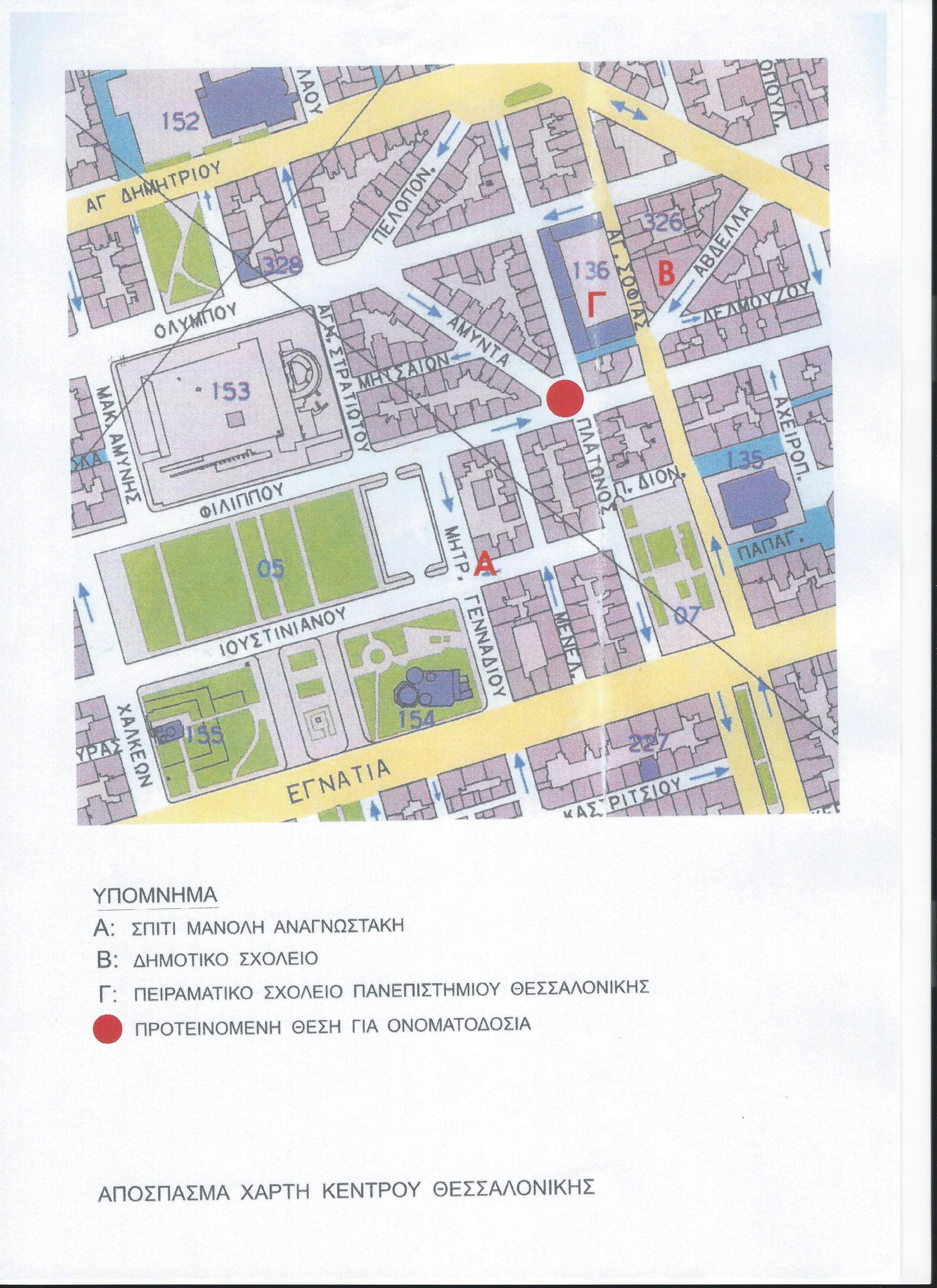 Μικρή αλλά καθοριστική λεπτομέρεια: Ο Μανόλης Aναγνωστάκης έζησε από τη βρεφική του ηλικία ως τα δεκαεφτά του χρόνια σε διαμέρισμα μιας οικοδομής που σώζεται έως σήμερα στη συμβολή των οδών Ιουστινιανού και Μητροπολίτου Γενναδίου, επί της Πλατείας Δικαστηρίων. Το Δημοτικό σχολείο στο οποίο φοίτησε βρισκόταν στην οδό Αγίας Σοφίας, λίγο πριν από τη διασταύρωσή της με την οδό Ολύμπου (εκεί που βρίσκεται σήμερα κάποιο σχολικό κτίριο), ενώ Γυμνάσιο πήγε στο παρακείμενο Πειραματικό. Στο μέσον, περίπου, της απόστασης που μεσολαβεί μεταξύ της κατοικίας του και των σχολείων του, στη συμβολή των οδών Φιλίππου, Αμύντα και Πλάτωνος σχηματίζεται ένα πλάτωμα. Στις 30 Ιανουαρίου του 2014 ο αρχιτέκτονας (και προσωπικός φίλος του ποιητή) Μιλτιάδης Πολυβίου κατέθεσε αναλυτική πρόταση ονοματοδοσίας προς τον δήμαρχο Θεσσαλονίκης, τους αντιδημάρχους Πολιτισμού και Αρχιτεκτονικού καθώς και προς την Επιτροπή ονοματοδοσιών) — και είναι αυτή η πρόταση που υλοποιείται πλέον, με αφορμή και την επετειακή συγκυρία της συμπλήρωσης 90 χρόνων από τη γέννηση και των 10 από τον θάνατο του Μανόλη Αναγνωστάκη.
