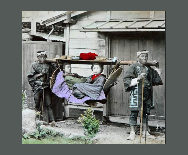 Ιαπωνία, 1886: Κατά τη διάρκεια του 19ου αιώνα, καθώς ο πληθυσμός στις ιαπωνικές πόλεις πύκνωνε με ταχύ ρυθμό, τα φορεία αποτελούσαν ένα δημοφιλές μέσο μεταφοράς (τα άλογα χρησιμοποιούνταν αποκλειστικά από τον στρατό και τους αξιωματικούς του). Τα Κάγκο μετέφεραν τους αστούς και τα Νοριμόνο τους ευγενείς. Οι μεταφορείς ήταν κανόνα τέσσερις, ώστε όταν κάποιος κουραζόταν να τον αντικαθιστά ένας ξεκούραστος· με τον τρόπο αυτό, ένα φορείο κάλυπτε την όχι ευκαταφρόνητη απόσταση των 5-6 μιλίων ανά ώρα. Η φωτογραφία είναι του Αντόλφο Φαρσάρι: γεννημένος το 1841 στη Βιτσέντζα, ο Φαρσάρι κατατάχτηκε αρχικά στον ιταλικό στρατό. Το 1863 μετανάστευσε στις ΗΠΑ και πήρε μέρος εθελοντικά στον Εμφύλιο, ως φανατικός υπέρμαχος της κατάργησης της δουλείας, με τον στρατό των Βορείων. Παντρεύτηκε Αμερικανίδα, αλλά ο γάμος απέτυχε κι έτσι το 1873 ο Φαρσάρι εγκατέλειψε γυναίκα και δύο παιδιά και μετανάστευσε στην Ιαπωνία. Εγκαταστάθηκε στη Γιοκοχάμα, όπου έγινε επιτυχημένος εκδότης ταξιδιωτικών οδηγών, χαρτών και μεθόδων εκμάθησης της ιαπωνικής για ξένους. Το 1883 έμαθε μόνος του φωτογραφία —διαβάζοντας σχετικά βιβλία και αγοράζοντας τον αναγκαίο εξοπλισμό χωρίς άλλη καθοδήγηση— και επεξέτεινε την επιχείρησή του συνεταιριζόμενος με τον φωτογράφο Ταμαμούρα Κοζαμπούρο, με τον οποίον αγόρασαν την Ιαπωνική Φωτογραφική Ένωση, δηλαδή το στούντιο των Στίλφριντ και Άντερσεν, που είχε την εποχή εκείνη δεκαπέντε εργαζομένους. Το 1886, ήταν πλέον ο μόνος εν ενεργεία ξένος φωτογράφος στην Ιαπωνία. Τον ίδιο χρόνο, το στούντιό του —και όλα του τα αρνητικά— καταστράφηκε από πυρκαγιά· το 1887 ταξίδεψε από άκρη σ’ άκρη την Ιαπωνία και τράβηξε πάνω από χίλιες φωτογραφίες προκειμένου να τα αντικαταστήσει. Ο Φαρσάρι είχε εξαιρετικούς συνεργάτες και οι εκτυπώσεις του είναι τεχνικά άρτιες και αριστοτεχνικά επιχρωματισμένες στο χέρι, με τεχνικές και υλικά εμπνευσμένα από την παραδοσιακή ιαπωνική ζωγραφική. Το 1890, ο Αντόλφο Φαρσάρι επέστρεψε στην Ιταλία, μαζί με την πεντάχρονη κόρη που είχε αποκτήσει με μια Γιαπωνέζα. Την εποχή εκείνη, το στούντιό του απασχολούσε τριάντα δύο εργαζόμενους, δεκαεννιά από τους οποίους ήταν επιχρωματιστές. Ο Φαρσάρι πέθανε στο πατρικό του στη Βιτσέντζα στις 7 Φεβρουαρίου 1908.
