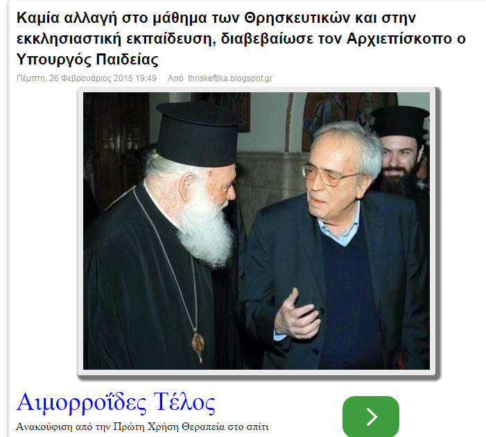 Διαβάσαμε σήμερα με χαρά στο έγκριτο Αγιορείτικον Βήμα —το οποίο, ως αριστεροί πατριώτες, παρακολουθούμε ανελλιπώς— ότι ο υπουργός Παιδείας Αριστείδης Μπαλτάς συναντήθηκε με τον Αρχιεπίσκοπο Αθηνών και πάσης Ελλάδος Ιερώνυμο και τον διαβεβαίωσε ότι «ότι δεν πρόκειται να υπάρξει καμία αλλαγή στο μάθημα των Θρησκευτικών και στην εκκλησιαστική εκπαίδευση». Ευτυχώς, προσθέτουμε εμείς, διότι κάτι τέτοιο θα ήταν σχεδόν χιτλερικό· σαν τα Πρότυπα Πειραματικά Σχολεία, ένα πράμα. Όπως μας διαβεβαιώνει το Αγιορείτικον Βήμα —που επικαλείται ως πηγή άλλο ένα αντισυστημικό μέσο, το thriskeftika.blogspot.gr— τώρα που ησυχάσαμε ότι κανείς δεν θα πειράξει τα θρησκευτικά, το πολύπαθο εκπαιδευτικό μας σύστημα θα απαλλαγεί και από τις αιμορροΐδες, προφανώς διά της μεθόδου τακτικών κολονοσκοπήσεων από στελέχη της Ριζοσπαστικής Αριστεράς και της Ορθοδόξου Εκκλησίας (εναλλάξ).