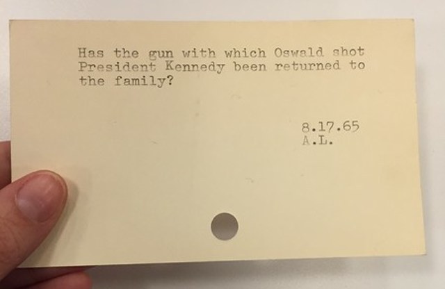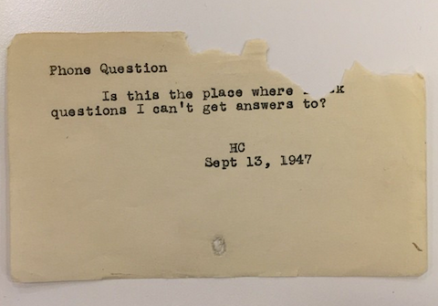 Πρόσφατα, μάλιστα, ανακαλύφθηκε ένα κουτί με καρτέλες στις οποίες είχαν σημειωθεί ερωτήσεις που είχαν τεθεί από το 1940 μέχρι το 1980 — καρτέλες των οποίων φωτογραφίες δημοσιεύονται πλέον σε τακτική βάση καθώς φανερώνουν μια πτυχή της ανθρώπινης περιέργειας εκείνης της εποχής — ή, καλύτερα, τις περιπτώσεις εκείνες της ανθρώπινης περιέργειας που οι βιβλιοθηκονόμοι τις βρήκαν αρκετά ενδιαφέρουσες για να τις κρατήσουν φυλαγμένες σε μια καρτελοθήκη στην οποία έδωσαν το όνομα «Ενδιαφέροντα ερωτήματα ερευνητών».