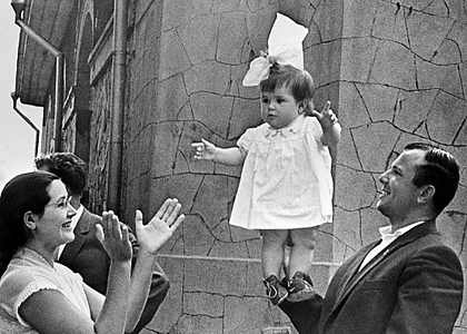 Yuri Gargarin and family. Yuri Gagarin (1934-1968, right), soviet cosmonaut and first man in space, with his daughter Galya (center) and wife Valentina (left) whilst on holiday in Crimea. Gagarin made the first manned space flight on 12 April 1961. He orbited the Earth once in the Vostok 1 spacecraft, a flight that lasted 1 hour and 48 minutes. Gagarin became a hero in the Soviet Union and famous worldwide. He later returned to active service as a test pilot, dying in a crash during a training flight in 1968. His ashes were interred with full military honours in the Kremlin Wall.