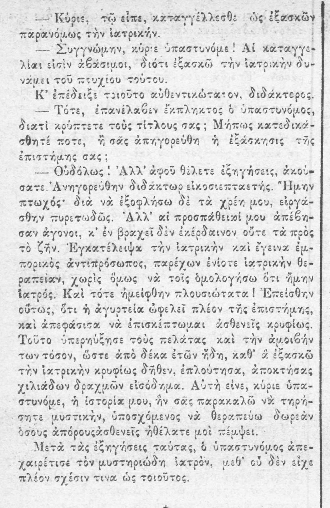Στην εφημερίδα Ακρόπολις φιλολογική, στο φύλλο αρ. 22 (26/6/1888), διαβάζουμε μια περίεργη ιστορία που αναφέρεται στις μυστηριώδεις στρεβλώσεις της αγοράς εργασίας — και συγκεκριμένα σε κάποιον που κατηγορήθηκε ως «γιατρός χωρίς πτυχίο» αλλά αποδείχτηκε πως είχε πτυχίο και το έκρυβε, γιατί έτσι έβγαζε περισσότερα.