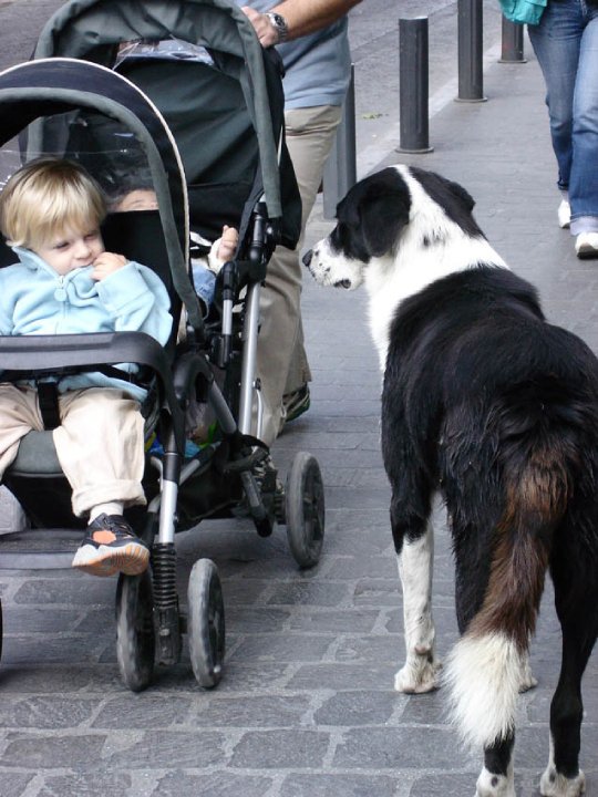 Το φωτογραφικό οδοιπορικό του Γιώργου Τσακνιά ανά την πόλη, με ήρωες τα σκυλιά της, αποτυπώνει, ίσως, τη δική τους οπτική για το αστικό τοπίο. Γι’ αυτά, εμείς είμαστε, ίσως, τα πιο παράξενα πλάσματα στους δρόμους.