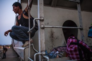 A Honduran waits the train in the station. He reserves his place when the train arrives to avoid loosing it, in Arriaga, Mexico, April 17, 2013.