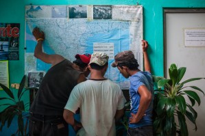 Inside of the Casa del Migrante Scalabrini, three Honduran migrants observe in a Mexico’s map the route to reach the United States, in Tapachula, Mexico, February 22, 2013.