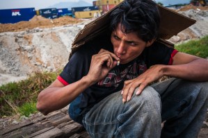 A Honduran immigrant smokes a cigarette and cover himself from the raining with a piece of cardboard while waits beside of the railroad to climb «the beast» or «train of death», referring to the freight train where thousands of migrants travel with the intention of reaching to United States, in State of Mexico, Mexico, August 20, 2008.