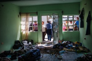 People watch inside of a room that was used to hide migrants kidnapped by a group of criminals and the police, in Lara Grajales, Mexico, October 13, 2008.
