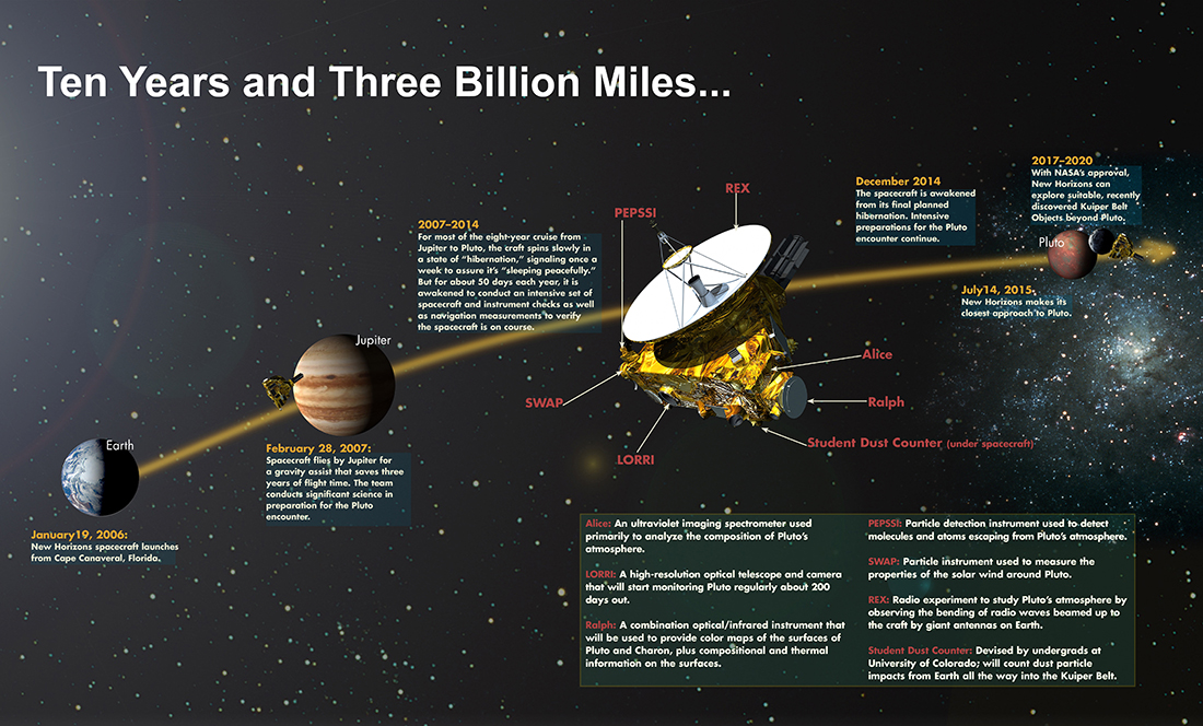 Το ταχύτερο σκάφος που εκτόξευσε ποτέ η αμερικάνικη διαστημική υπηρεσία ξεκίνησε πριν από εννέα χρόνια το ταξίδι του στον διαστημικό «Κάτω Κόσμο», σε μια πρώτη αλλά πολύ σημαντική προσπάθεια εξερεύνησης του πλανήτη και της υπόλοιπης οικογένειας: του Χάροντα, του μεγαλύτερου δορυφόρου, και των φεγγαριών Κέρβερος, Στύγα, Νύχτα και Υδρα. Όλο το σύστημα του Πλούτωνα είναι εμπνευσμένο από την ελληνική μυθολογία του Κάτω Κόσμου.