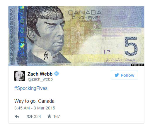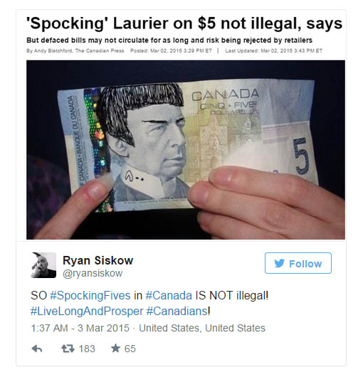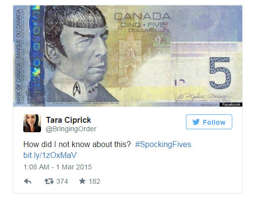 Φαίνεται ότι το πρόσωπο του Ουίλφριντ Λόριελ, έβδομου πρωθυπουργού της χώρας, που απεικονίζεται στο καναδικό πεντοδόλαρο, παρουσίαζε έτσι κι αλλιώς μια κάποια ομοιότητα με τον Μίστερ Σποκ του Star Treck. Ε, λοιπόν, μετά τον θάνατο του Λέοναρντ Νίμοϊ, οι Καναδοί φαν του δεν μπορούν να κρατηθούν: παρεμβαίνουν εικαστικά στο πεντοδόλαρο, προικίζοντας τον Λόριελ με μυτερά αυτιά, ανωφερή φρύδια και βέβαια την χαρακτηριστική Βούλκαν κουπ.