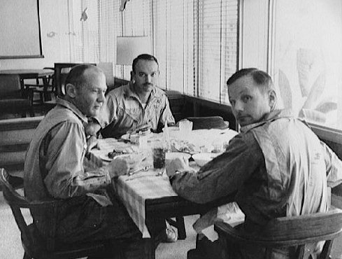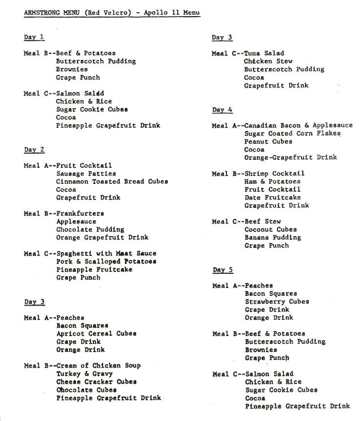Στην αποστολή του Apollo 11 οι τρεις αστροναύτες έτρωγαν τρία γεύματα τη μέρα (με το κουτάλι) μέσα από πλαστικά σακουλάκια. Οι αστροναύτες προσέθεταν στα φαγητά νερό: ο σκοπός ήταν να έχουν αρκετή υγρασία ώστε να κολλούν στο κουτάλι και να μην αυτονομούνται· παρά ταύτα, πρέπει να έμοιαζαν σε μάλλον δυσάρεστο βαθμό με κονσέρβες σκυλοτροφής, αν και είχε καταβληθεί μεγάλη προσπάθεια ώστε τουλάχιστον η μυρωδιά τους να αντιστοιχεί με την ονομασία τους στον κατάλογο του «μενού». Η αλήθεια είναι, πάντως, ότι διαθέτουμε ελάχιστα στοιχεία σχετικά με το πώς ήταν πραγματικά η γεύση τους. Ξέρουμε μόνο ότι το αγαπημένο έδεσμα του Όλντριν ήταν οι γαρίδες κοκτέιλ και του Άρμστρονγκ τα μακαρόνια με σάλτσα κρέατος.