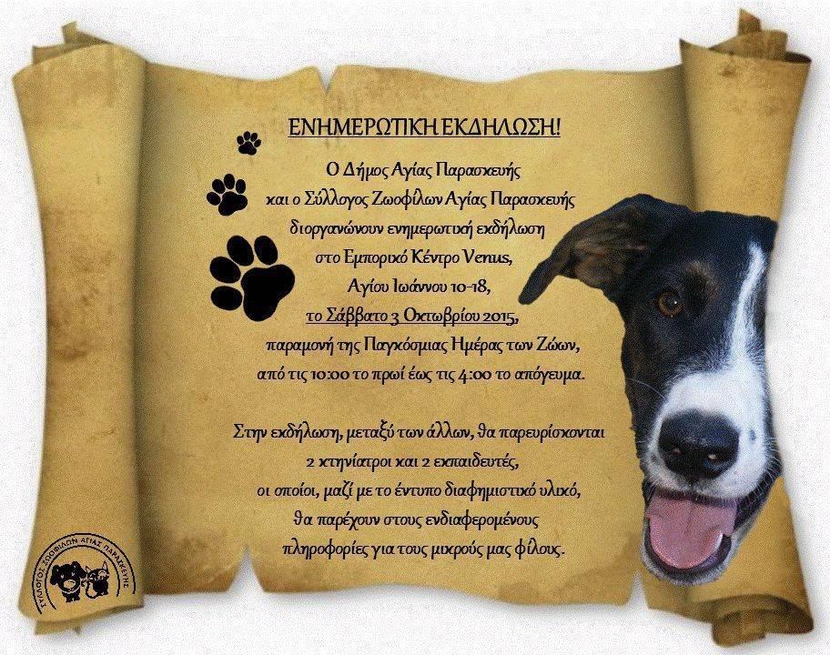 Το dim/art σάς ενημερώνει για εκδηλώσεις που θα πραγματοποιηθούν στη χώρα μας με αφορμή τον εορτασμό της Ημέρας των Ζώων, με την ευχή να έχουν επιτυχία και να ευαισθητοποιήσουν όσο το δυνατόν περισσότερους συμπολίτες μας και κυρίως παιδιά.