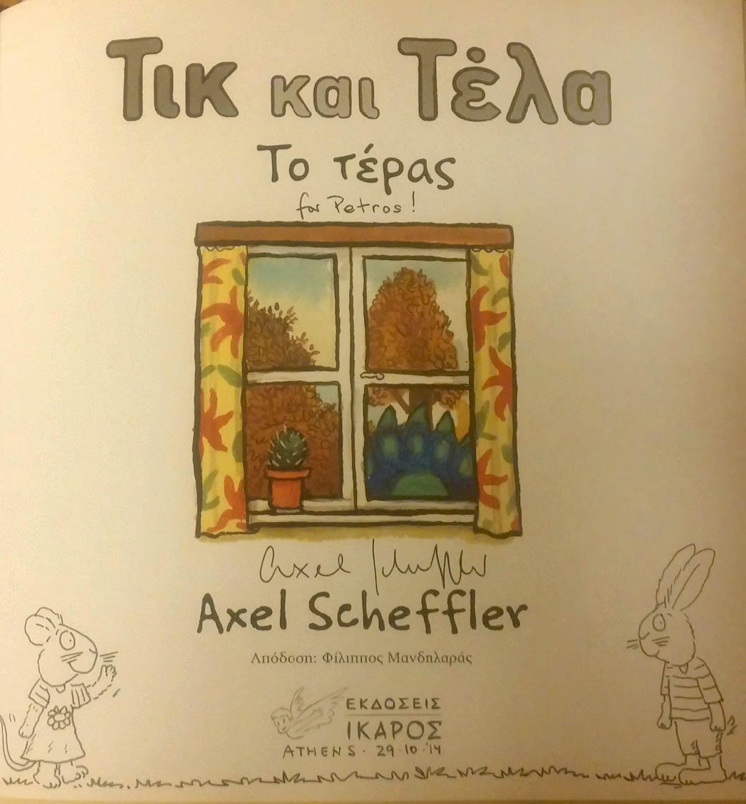 Πέρυσι τέτοια εποχή, ο συγγραφέας και εικονογράφος της σειράς Axel Scheffler —Γερμανός, γεννημένος το 1957, εγκατεστημένος στο Λονδίνο— ήρθε στην Ελλάδα για διακοπές και είχα την τύχη να τον συναντήσω στα γραφεία του Ίκαρου στην οδό Βουλής. Μιλήσαμε για το πώς στράφηκε στην εικονογράφηση, για το τι κάνει τις ζωγραφιές του τόσο αγαπητές στα μικρά παιδιά και για το αν η κόρη του είναι αυστηρή κριτής των βιβλίων του. Ήταν πολύ προσιτός και μας είπε πόσο εντυπωσιασμένος ήταν από την επιτυχία της σειράς με τον ΤΙΚ και την ΤΕΛΑ στην Ελλάδα. Και ότι ενώ πίστευε ότι Το Μπαλόνι θα ήταν το τελευταίο βιβλίο σκέφτεται να γράψει άλλο ένα. Στο τέλος της συνάντησης μας υπέγραψε για τον Πέτρο «Το τέρας» κάνοντας και ένα μικρό σχέδιο μαζί με την αφιέρωση. Μας είπε ότι το κάνει πάντα όταν υπογράφει βιβλία του στους μικρούς θαυμαστές τους. Ο μικρός Πέτρος ενθουσιάστηκε και το βιβλίο βρίσκεται σε περίοπτη θέση στην βιβλιοθήκη μας.