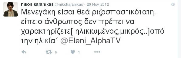 [1] Πηγή: Νέο σόου Καρανίκα -Ο σερβιτόρος που διορίστηκε στο Μαξίμου απαντά: Ναι, μου αρέσει η Μενεγάκη | iefimerida.gr http://www.iefimerida.gr/news/254874/neo-sooy-karanika-o-servitoros-poy-dioristike-sto-maximoy-apanta-nai-moy-aresei-i#ixzz429vaSsB8