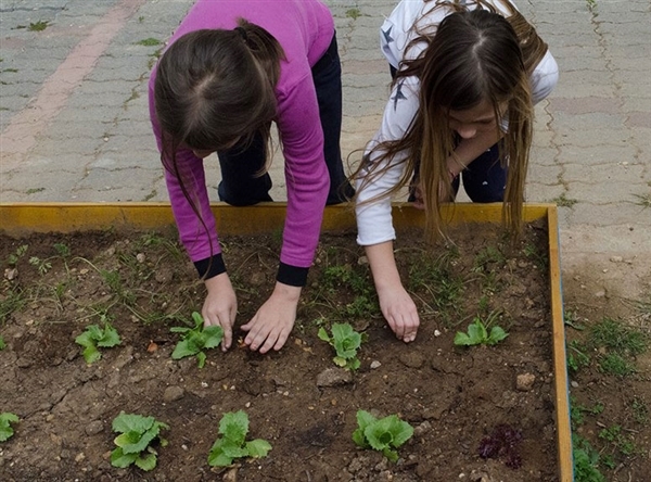 «Πώς σας ήρθε να ξεκινήσετε μία τέτοια ιδέα;» ρωτήσαμε τη Χριστίνα Καρκάνη και τη Δώρα Βαγενά, δασκάλες στο 14ο Δημοτικό Σχολείο Αιγάλεω, όπου στα ελάχιστα διαθέσιμα τετραγωνικά μέτρα της αυλής τους τα παιδιά συντηρούν μεγάλη ποικιλία από εποχικά λαχανικά, αλλά και ελληνικές ποικιλίες από κουκιά, ρεβίθια, λούπινα. «Θέλαμε να κάνουμε κάτι μαζί με τα παιδιά για να τους μάθουμε τα ξεχασμένα ελληνικά φυτά, αλλά και να τα βοηθήσουμε να εξοικειωθούν με όλα τα στάδια παραγωγής της τροφής τους. Έτσι μαθαίνουν σιγά-σιγά ότι η φρεσκοκομμένη σαλάτα και τα βραστά παντζάρια από τον κήπο είναι φαγητό», μας εξηγούν όσο ετοιμάζουν τη μαρουλοσαλάτα (από τον κήπο τους) που θα συνοδέψει το μεσημεριανό φαγητό των μαθητών.