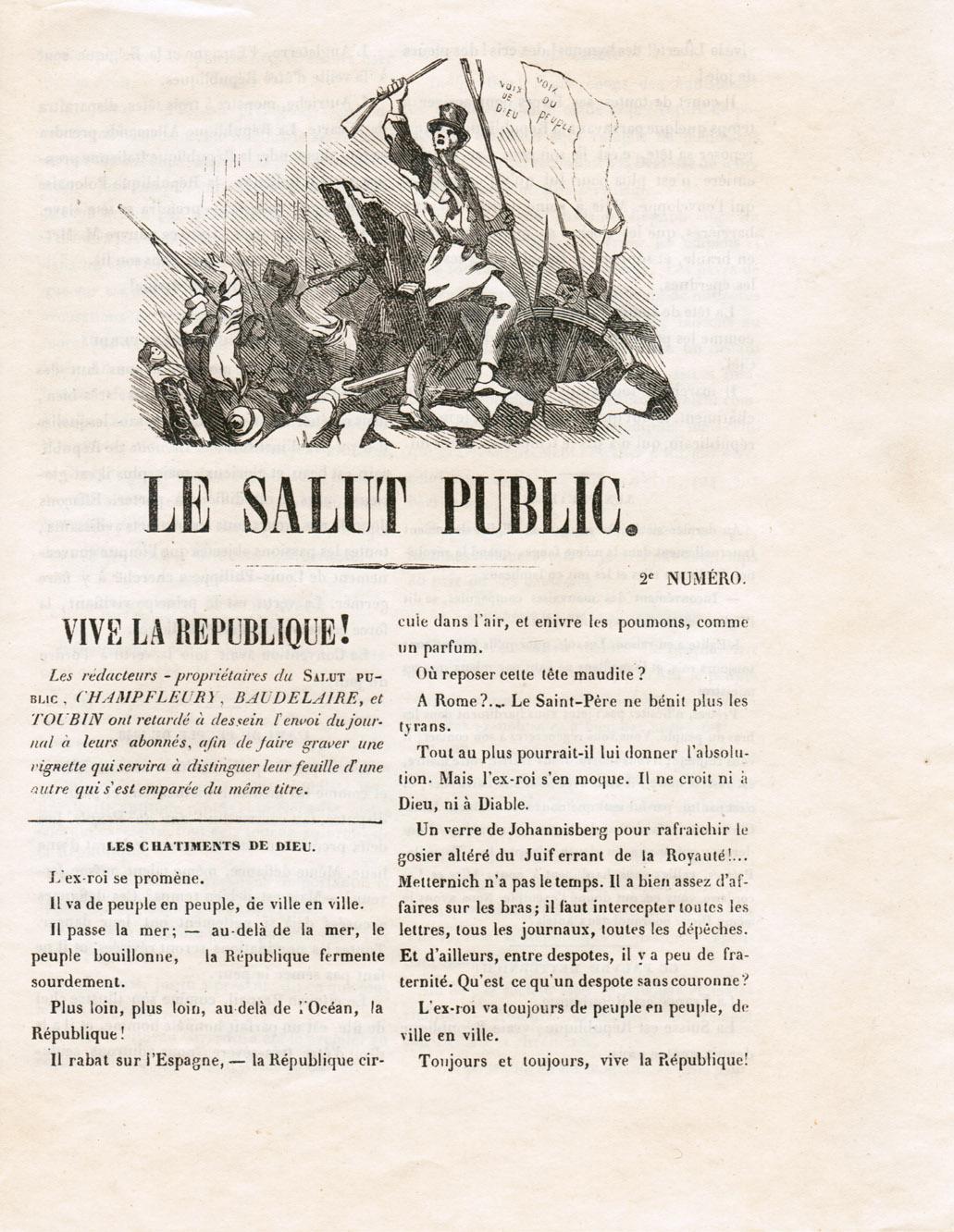 1848 Ο Μπωντλαίρ συμμετέχει στα γεγονότα της επανάστασης του Φεβρουαρίου. Λέγεται ότι τον είδαν ζωσμένο μ’ ένα τουφέκι να φωνάζει έξαλλος: «Να τουφεκίσουμε τον στρατηγό Οπίκ!» Την ίδια περίοδο εκδίδει με δυο φίλους του τη βραχύβια σοσιαλιστική εφημερίδα Le Salut public.