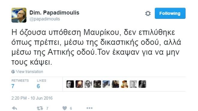 Το τελευταίο του σχόλιο-ετυμηγορία σχετικά με τον θάνατο του εκδότη Παναγιώτη Μαυρίκου («Η όζουσα υπόθεση Μαυρίκου, δεν επιλύθηκε όπως πρέπει, μέσω της δικαστικής οδού, αλλά μέσω της Αττικής οδού. Τον έκαψαν για να μην τους κάψει») καταδεικνύει αφενός μεν την επιδεξιότητά του στα λογοπαίγνια (δύο μέσα σε 140 χαρακτήρες ακριβώς), αφετέρου δε την αξιοθαύμαστη επίδοσή του στο άθλημα της απελευθέρωσης: ενώ αναφέρεται, μάλλον από κεκτημένη ταχύτητα, στο τι «πρέπει», την ίδια στιγμή το αναιρεί και, αγνοώντας με γενναιότητα οποιαδήποτε έννοια κανόνων του πολιτισμένου κόσμου, όπως για παράδειγμα η αστυνομική έρευνα και οι διαδικασίες απονομής δικαιοσύνης, ο εκπρόσωπος του ελληνικού λαού στο ευρωκοινοβούλιο αποφαίνεται επί του θέματος με τον βαθυστόχαστο τρόπο που θα ζήλευε όποιος απλός πολίτης σχολιάζει, μεταξύ τυρού και αχλαδίου την επικαιρότητα, εφόσον βέβαια έχει δει και αρκετές αστυνομικές ταινίες.