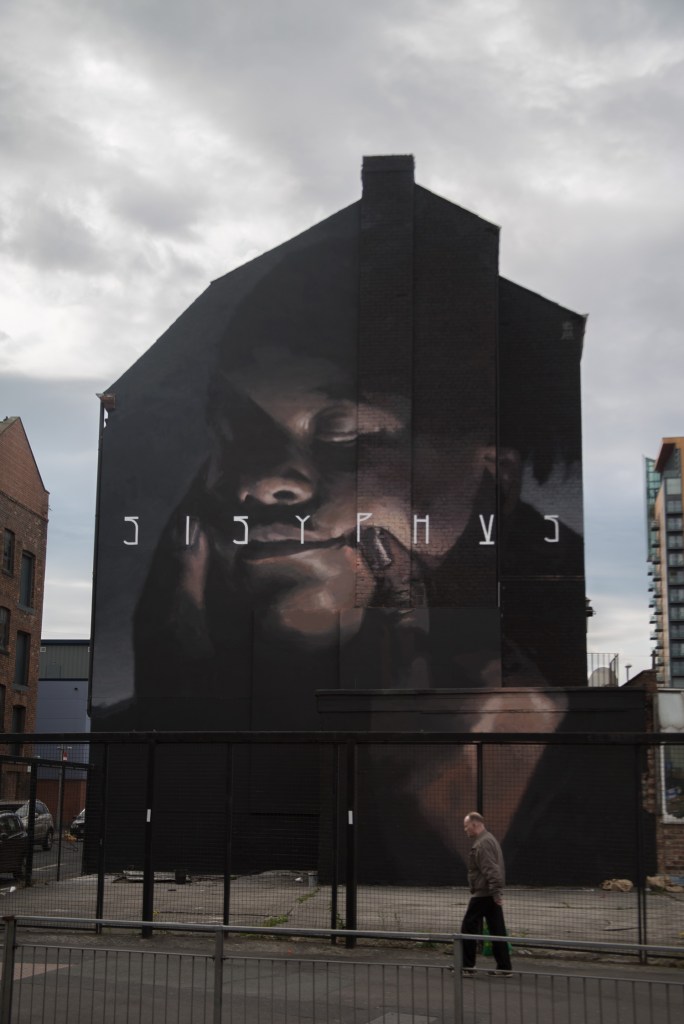 Πριν από έναν περίπου μήνα, στο πλαίσιο του Φεστιβάλ γκράφιτι Cities of Hope (21-29/5/2016) στο Μάντσεστερ, ο γεννημένος το 1986 στο Μαϊάμι από Αϊτινή μητέρα και Ισπανό πατέρα street artist Axel Void (Alejandro Hugo Dorda Mevs), έφτιαξε μια τοιχογραφία όπου απεικονίζεται ένα κοριτσίστικο πρόσωπο, που ένα χέρι το αναγκάζει να χαμογελά. Το όνομα του Σίσυφου, γραμμένο σαν λεζάντα με γραμματοσειρά και τεχνοτροπία που παραπέμπουν σε ψηφιακή τέχνη, χρησιμοποιείται σημειολογικά, παραπέμποντας μάλλον στην προσέγγιση του μύθου από τον Καμύ, ως σχόλιο στην ανθρώπινη κατάσταση και στη ματαιότητα της αναζήτησης νοήματος της ύπαρξης.