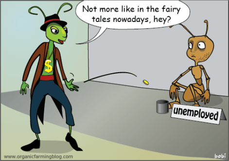 Το κατάλαβα σήμερα το βράδυ που άκουγα τα τζιτζίκια να μην σταματάνε το αέναο τραγούδι τους. Και φυσικά θυμήθηκα τον γνωστό του μύθο. Και νευρίασα. Γιατί δηλαδή ήταν καλύτερο το μυρμήγκι; Που έξω ήταν χαρά Θεού κι αυτό ζαλωνόταν ό,τι έβρισκε μπροστά του και τροχάδην να το πάει στην φωλιά; Εργάτης ήταν, χωρίς ένσημα, χωρίς ιατρική περίθαλψη, μη και στραμπούλαγε πόδι, κανείς δεν θα γύριζε να το κοιτάξει ή να το γιατροπορέψει, αναλώσιμος και στην ιεραρχία στον πάτο. Αντιστάθηκε ποτέ; Όχι βέβαια! Φορτωμένος και κουρασμένος, έπρεπε να πηγαινοέρχεται την ίδια διαδρομή, ο ένας πίσω από τον άλλο, το μόνο που έβλεπε ήταν τα οπίσθια του μπροστινού του, για να κοιτάξει κάνα λουλούδι ούτε λόγος, για να πάει λίγο παραπέρα από την γραμμή, καμία περίπτωση. Εν δυο, εν δυο, συνέχεια. Το «εμπρός της γης οι κολασμένοι», ούτε που το είχε ακούσει. Αλλά το θαυμάζουμε, είναι το καλό παράδειγμα ενάντια στον τεμπέλη τζίτζικα.