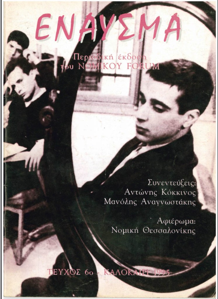 Πριν από αρκετά χρόνια, όταν βρισκόμουν στο τελευταίο έτος της Νομικής, είχαμε συναντήσει, μαζί με έναν συμφοιτητή, τον Μανόλη Αναγνωστάκη για μια συνέντευξη που δημοσιεύτηκε σε περιοδικό της σχολής. Μέχρι πρόσφατα, το τεύχος εκείνο το θεωρούσα χαμένο, μετά από τόσο καιρό και τόσες μετακομίσεις… Αναζητώντας πρόσφατα κάτι άλλο στο πατρικό μου σπίτι, ανακάλυψα ένα κουτί με μεμοραμπίλια της εποχής — μαζί και το περιοδικό.