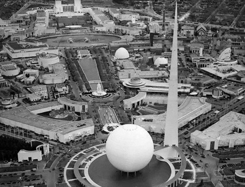 Στα πλευρά, αριστερά: ο Whalen (βλ. [16]) κάνει τα αποκαλυπτήρια του Trylon. Το Trylon (ένας οβελίσκος ύψους 190 μέτρων) και το Perisphere (μια σφαίρα διαμέτρου 180 μέτρων), δύο κατασκευές των αρχιτεκτόνων Wallace Harrison και J. Andre Fouilhoux, ήταν τα σύμβολα της Παγκόσμιας Έκθεσης του 1939.