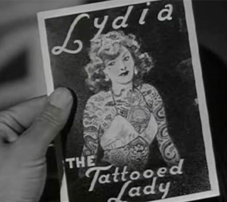 Στην ταινία των Marx Brothers At the Circus (1939, σκηνοθεσία: Edward Buzzell) ακούγεται (μεταξύ άλλων) ένα τραγούδι με τίτλο “Lydia, the Tattooed Lady”. Ο Groucho τραγουδάει, ο Chico παίζει πιάνο και ο Harpo περιφέρεται και σπέρνει τον πανικό, ως συνήθως. Η μουσική είναι του Harold Allen και οι στίχοι του Yip Harburg. (Πρόκειται για το δίδυμο που υπογράφει και τα τραγούδια της ταινίας The Wizard of Oz, που παίχτηκε επίσης το 1939 – δηλαδή, για δύο τραγουδοποιούς με ξεχωριστή θέση στην αμερικανική pop culture, οι οποίοι βρίσκονται πίσω τραγούδια που σημάδεψαν τον 20ο αιώνα, όπως το Over the Rainbow, κ.ά.)