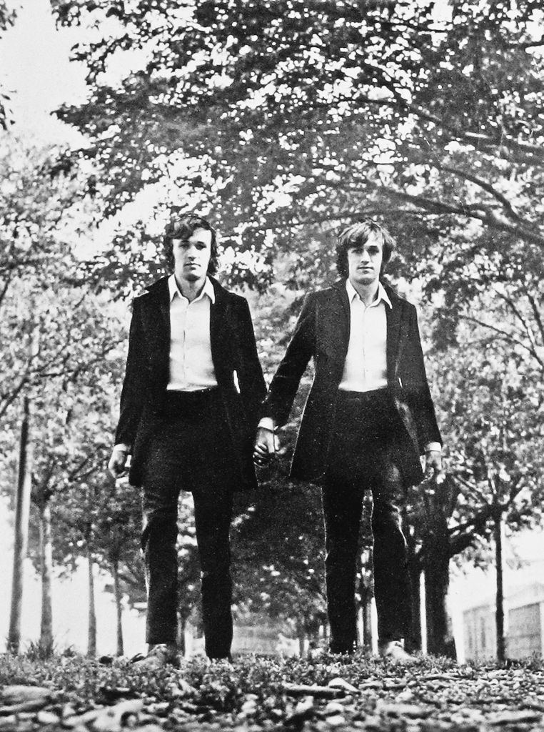 Alighiero Boetti, «Οι δίδυμοι». Φωτομοντάζ 1968, εκτύπωση σε κάρτες 13Χ17 εκ., πενήντα αντίτυπα, τα οποία έστειλε ως καρτ ποστάλ σε φίλους του. Τον Alighiero Boetti απασχολούσε πολύ το ζήτημα του χρόνου, του εαυτού και της διαλεκτικής σχέσης των εαυτών στο πέρασμα του χρόνου. Στη συγκεκριμένη αυτοπροσωπογραφία, δύο εαυτοί του κρατιούνται χέρι χέρι. Το 1973, ο Boetti άλλαξε επισήμως το όνομά του σε Alighiero e Boetti (Αλιγκιέρο και Μποέτι),.